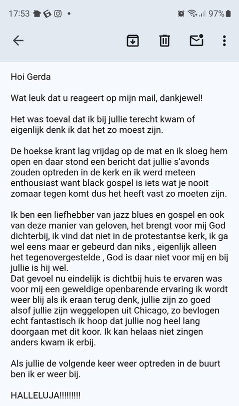 Ik wil jullie nog graag een keer zeggen hoe we allemaal intens van jullie optreden genoten hebben. Het was een van de hoogtepunten van een sws prachtige dag: we horen nog steeds van gasten hoe geweldig ze jullie vonden. Het was een groot feest om jullie te horen en te zien, en tegelijkertijd was ik - net als anderen - diep geraakt. Ik denk er nog vaak aan terug... met een grote glimlach. Woonde ik maar in Rotterdam (en kon ik maar zingen... )